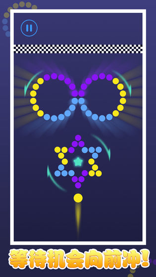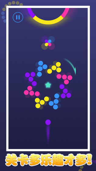 简单的玩法层层递进,玩家需要点击小球,使小球能够撞到屏幕正中间不断旋转的彩色圆环,小球的颜色与撞击区域颜色相同的话就会消除该区域,通过每个挑战获得的金币可以用来解锁新的姿势小球!