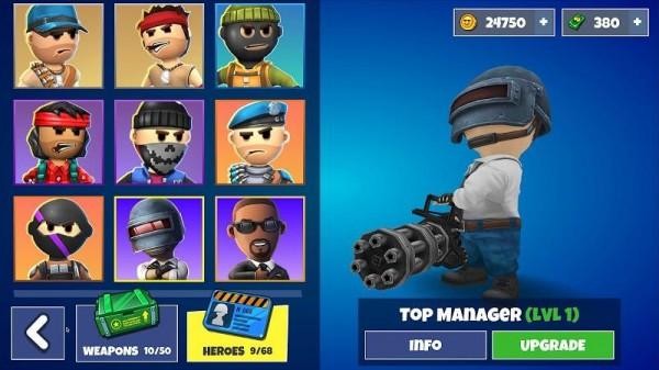 勇士大作战以刺激的射击战斗竞技对决为玩法方式,大逃杀类型的生存挑战,在广阔的地图场景当中和很多其他的对手进行对决,灵活的运用角色能力还有武器装备去战斗,生存到最后很有挑战性。