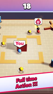 这款游戏非常轻松易上手的趣味游戏,在配上动感的音乐给你更多的游戏乐趣。在一个地图里只有一个炸弹人,尽量快速跑到远离炸弹人的区域,炸弹人快要追上的时候可以点击下滑按钮从炸弹人的下方溜走,炸弹人是不会停止的。喜欢的小伙伴赶紧下载体验你追我跑的追逃感吧!