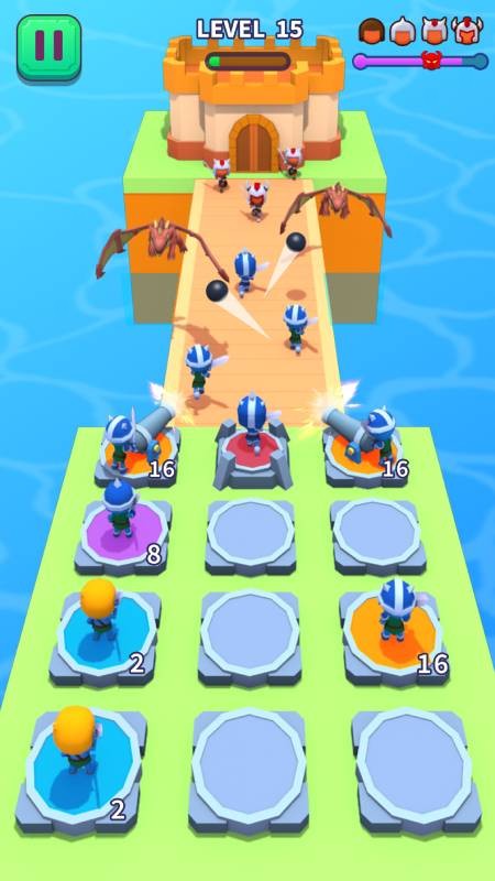 合成攻城队正版以烧脑刺激的攻城战斗闯关挑战为主要的游戏玩法的设计,面对各种各样的对手城池,玩家可以思考各种策略战术的运用,部署士兵角色去抵御对手的士兵,消灭所有敌人然后攻占城池。
