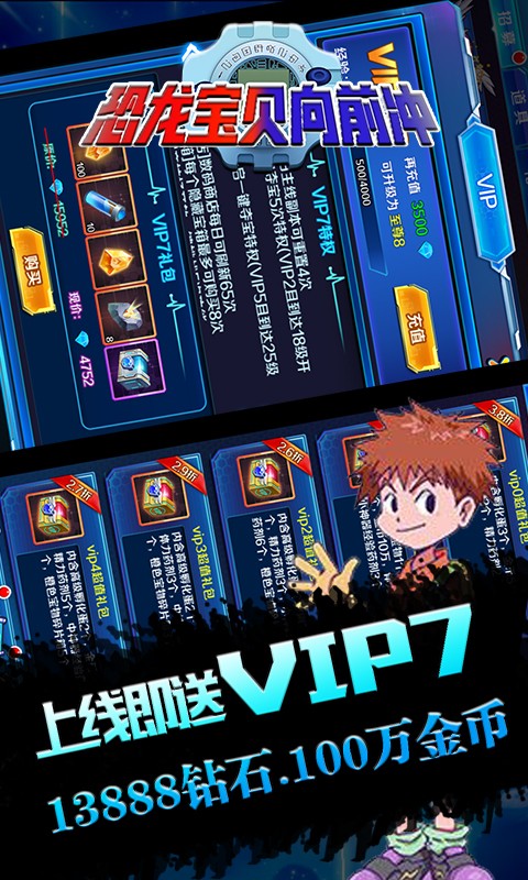1、上线赠送VIP7、13888钻石、100W金币、999体力;