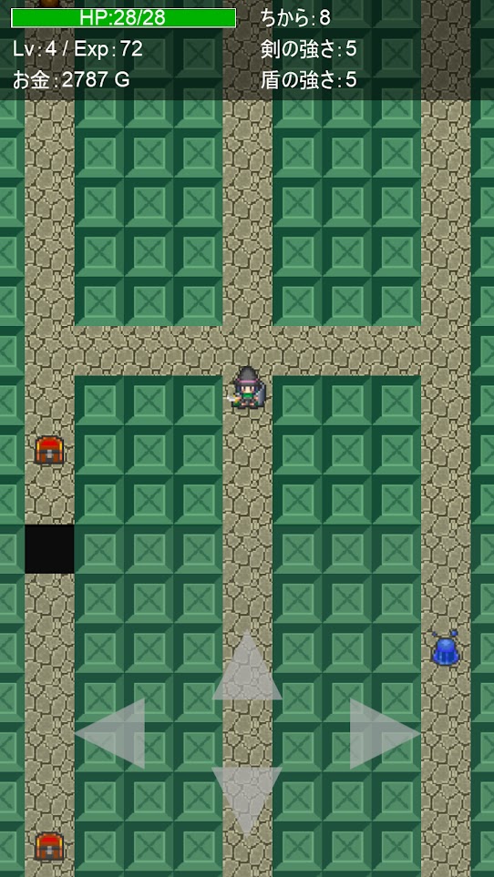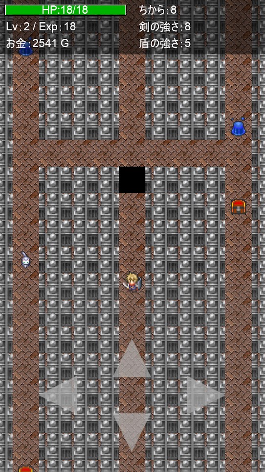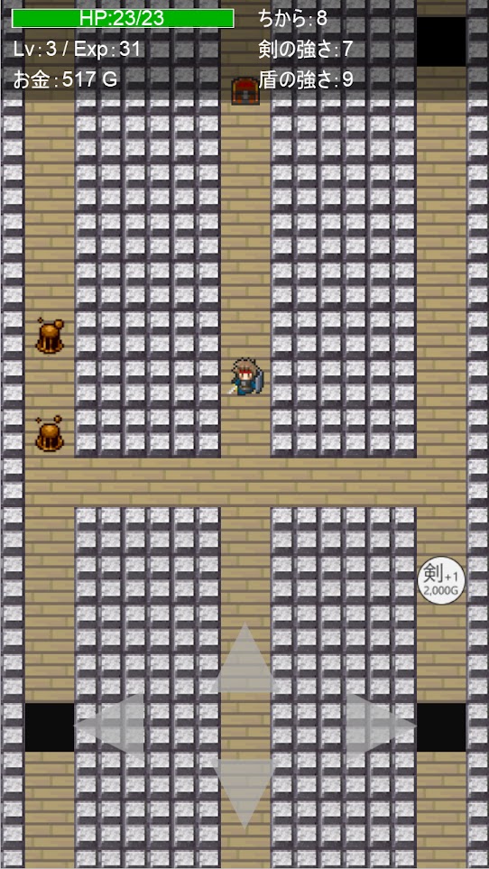 这是一个每次游玩的时候,地下城的宝箱会随机生成,从宝箱得到剑或盾并强化它们,再打倒怪兽,并试着从地下城中逃出的游戏。