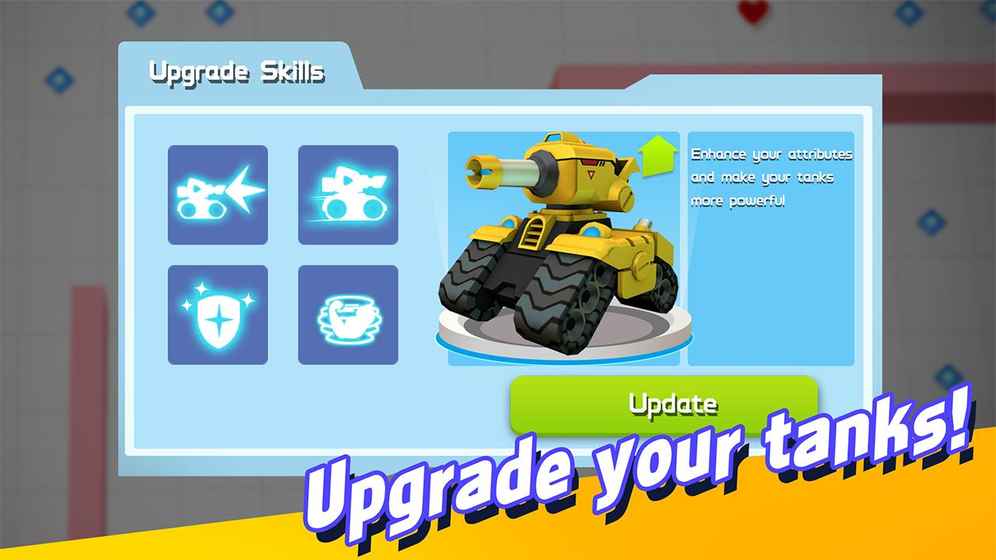 坦克进化大作战安卓版是一款全新的坦克射击游戏。在游戏中玩家将操控一辆可以不断进化变强的坦克在坦克战场中厮杀。搜集战场中的钻石或是击杀敌人的坦克都可以获得经验值,使用这些经验值提升你的坦克性能成为战场中的大魔王吧!