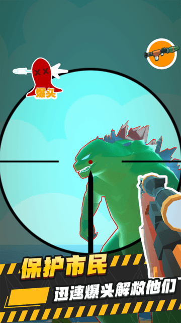 3、不同实力的巨兽消灭的难度不一样,需要玩家选择合适的狙击枪使用射击闯关;