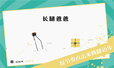长腿爸爸是一款非常有趣的跑酷类休闲游戏。游戏中长腿欧巴可不是那么好当的,走路都很困难,所以他很需要玩家帮他走路。游戏中,玩家需要通过重力感应、倾斜设备控制一个长腿小方块往前移动,游戏目标就是需要让它尽可能走远一些,每隔一段距离路上都会有路程标记。