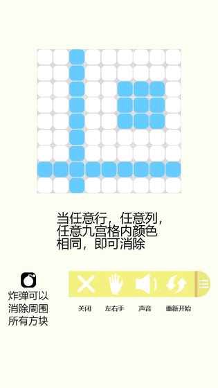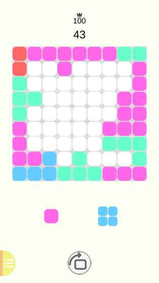 qqzi是一款简单有趣,老少皆宜的一款消除类小游戏。你需要做的就是将方块放入方格中,当任意九宫格,任意行,任意列的方格中颜色相同时,即可将它们消除。当方块无处可放时,游戏结束。