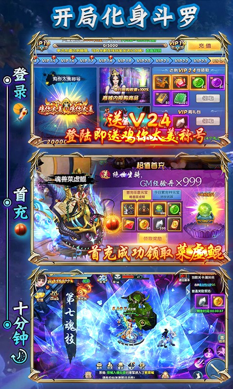 2.首充送魂兽菜虚鲲,有可能还会打篮球喔,还有绝世武器,精美礼包道具,助纣为虐!