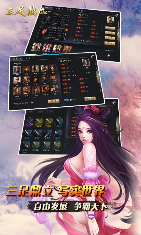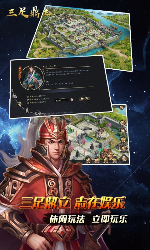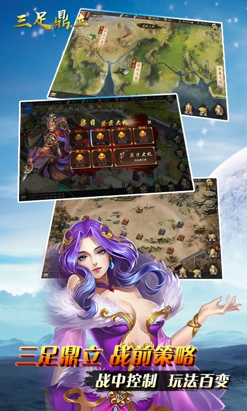 《三足鼎立》是一款还原经典,追溯回忆的三国题材策略游戏,真正的扮演武将角色,经历不同的剧情发展,呼朋唤友,建设军团,boss大战、兵临城下,组队副本。玩法百变,绝不雷同,画面细腻,特效震撼。分分钟带你进入自己的专属世界。