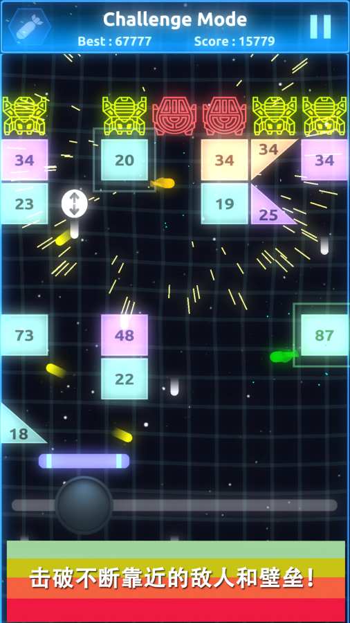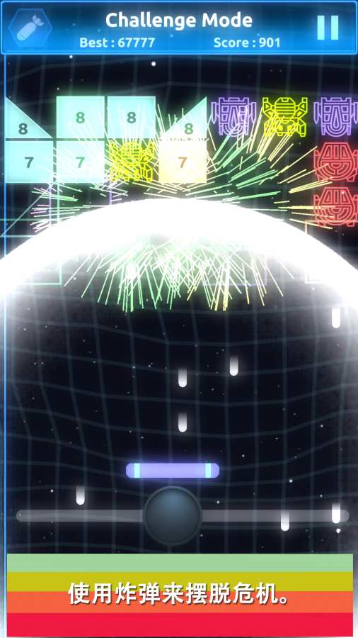 好玩又炫酷的打砖块游戏,将打砖块的经典玩法与onemorebrick进行结合,加上炫酷的几何图形和光影特效,相当的令人震撼,更加丰富有趣的道具使用和极具创意的游戏机制更是无处不在给人惊喜,被你反复弹射接起的球会有着毁天灭地的力量,同时还有爆破反馈,打击感特别的强!