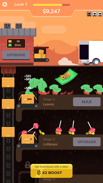 安卓下载 大小:29.09MB 下载:92次 蚂蚁工厂 益智休闲 支 持:安卓 分 类:手机游戏 大 小:29.09MB 版 本:1.0.11 下载量:92次 发 布:2022-08-20 16:47:49 特 色:蚂蚁工厂下载_蚂蚁工厂游戏安卓版v1.0.11下载 安卓下载 #蚂蚁工厂截图 #蚂蚁工厂简介 蚂蚁工厂是一款休闲的休闲放置类游戏,游戏采用清新简约的卡通画风,在游戏中玩家们将控制蚂蚁们为了金钱尽心尽力的去工作,而我们可以通过点击放置让它们为工厂专区利润。游戏特色1、游戏采用精美的卡通画风,趣味的模拟经营玩法;2、招募蚂蚁员工搬运货物,尽心尽力的去完成工作;3、轻松地点击控制屏幕,不断地鞭策他们获取利润;4、真实反映了现实生活,带给大家无尽的欢乐。游戏简介比996更加严苛的制度!便是蚂蚁社会分工明确,全员无休,为了蚁后尽心尽力直到生命的尽头也会想着如何工作而在未来世界,蚂蚁员工变成了现实!