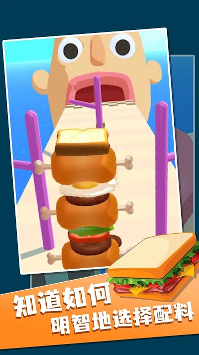 小飞棍来了是一款很简单有趣的休闲跑酷游戏,你可以在这里自由的去感受到各种各样简单有趣的挑战和玩法的你需要根据任务的指引去收集到各种各样不同的食材,组合去搭配出一个三明治最终被吃掉。