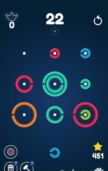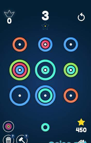 这是一个非常简单和放松的游戏的颜色圆圈和堆栈。它是由第三场比赛的游戏和颜色线。另一方面,你可以看到这是很熟悉的XOXO游戏Tic tac脚趾。用户需要切换颜色环上的九分之一栈板。一个点最多可以叠加3个不同大小的环,颜色无关紧要。当3个相同颜色的环形成一条线或一个完整的堆栈时,它们将爆炸并得分。