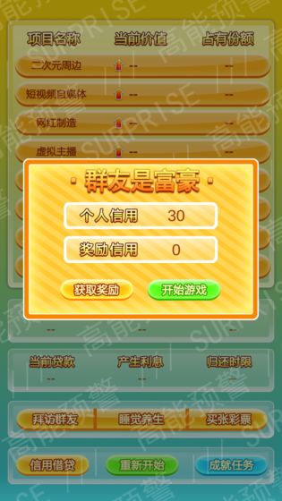 安卓下载 大小:31.85MB 下载:143次 群友是富豪 模拟经营 支 持:安卓 分 类:手机游戏 大 小:31.85MB 版 本:0.1 下载量:143次 发 布:2022-09-08 21:57:59 特 色:群友是富豪游戏下载_群友是富豪安卓版下载 安卓下载 #群友是富豪截图 #群友是富豪简介 群友是富豪是一款不一样的趣味模拟经营养成赚钱游戏,游戏中玩家可以尝试去挑战各种各样丰富的产业,短视频、二次元、主播等等丰富的游戏职业供你选择,赚取更多的金币来探索其他行业,一起来玩吧!游戏特色1、众多丰富的游戏成就等你来解锁。2、通过买卖来赚取期间众多的利润。3、超可爱的Q版像素风美术画面。4、简单趣味的游戏玩法让你爱不释手。编辑推荐这是一个简单的模拟投资游戏,在看似靠谱的群友们所经营的项目中甄选出自己看好的项目并买入份额!审时度势,在适当的时候进行买卖操作,成就亿万富翁!当然除了买卖挣钱之外,还有一些奇怪的小彩蛋...