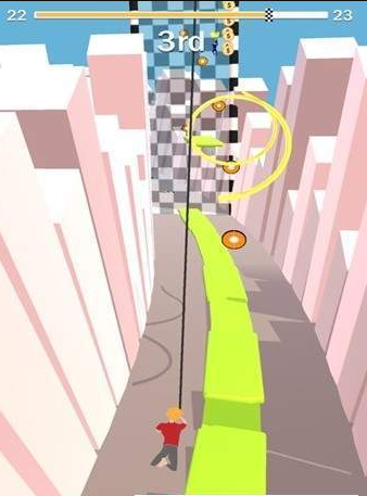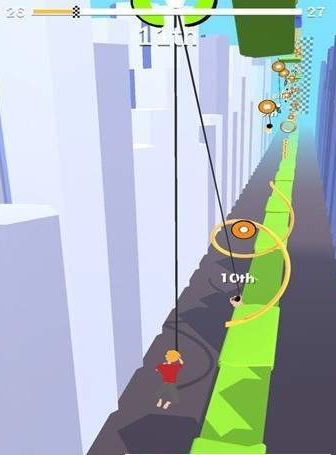 玩家需要利用绳索来移动,通过像钟摆一样的摆动,让自己有惯性向前冲,冲的越远越好。收集道路上的各种道具以及金币,道具可以用来减速敌人,金币可以用来购买其他的物品以及人物解锁。
