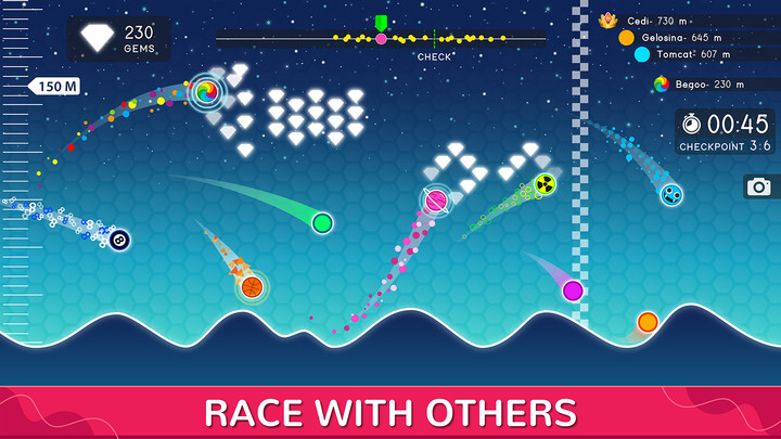 在场景画面中,我们可以看到有许多小球正在山丘地形的道路上飞速前进,玩家需要控制自己的专属小球不断的超越前面的球球对手,让自己的小球始终滚动在最前进,那么玩家的小球就会是这次球球丘陵竞速的第一名。