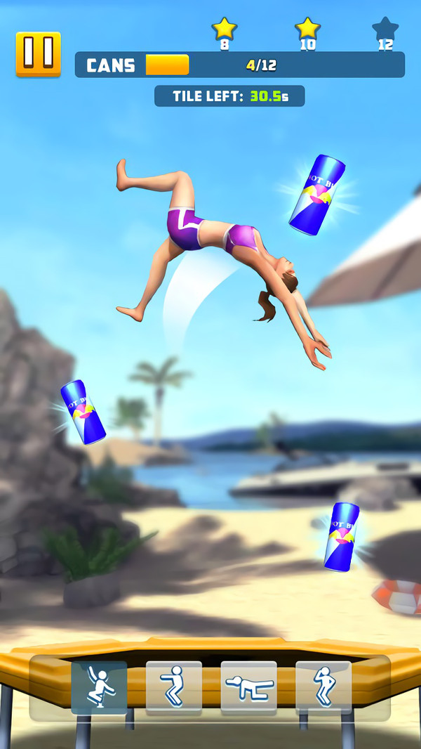 《翻转反弹》是一款基于定制物理引擎的模拟蹦床跳跃游戏。在您的家门口,后院,学校以及码头的蹦床上前后翻滚,跳高和反弹,掌握精彩绝伦的翻转技巧!用你的手指,灵活的控制你的人物,努力保持平衡,挑战高难度的蹦床得分挑战!