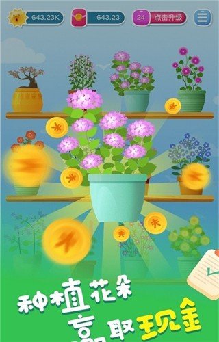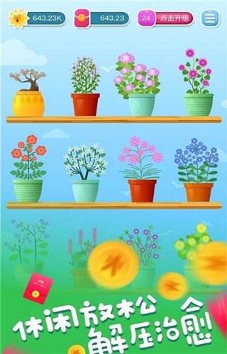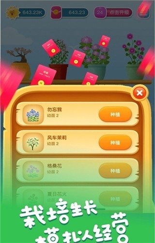 花开有宝是一款种植花的游戏,玩家是可以在游戏中去种植自己喜欢的花的,在成长的过程中是可以领取到很多的红包的,不管花的形态变化成什么样子,你只需要在空闲的时间里面去玩耍就可以了。