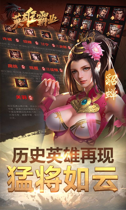 《英雄霸业》是一款以三国题材为背景的,卡牌对战类SLG策略手机网络游戏。作为三国类游戏,团队在设计上尽量还原历史,不论从章节剧情上还是武将的设计上也都尽量复合历史事实。除了以往玩家熟悉的各种系统外,游戏更独创设计了即时性的世界战场,供玩家征战天下,国家战场全天开放,每时每刻攻城略地,皇图霸业尽在其中。