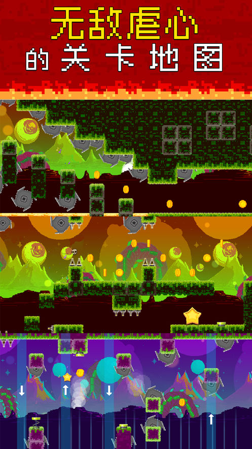 节奏冲刺是一款具有像素风的赛博朋克节奏平台跳跃类游戏。游戏中,玩家只需跟随音乐节奏,躲避尖刺与障碍物,一路冲刺到底,并且在路途中收集尽可能多的金币与星星,解锁各路英雄角色,探索新的黑洞世界!