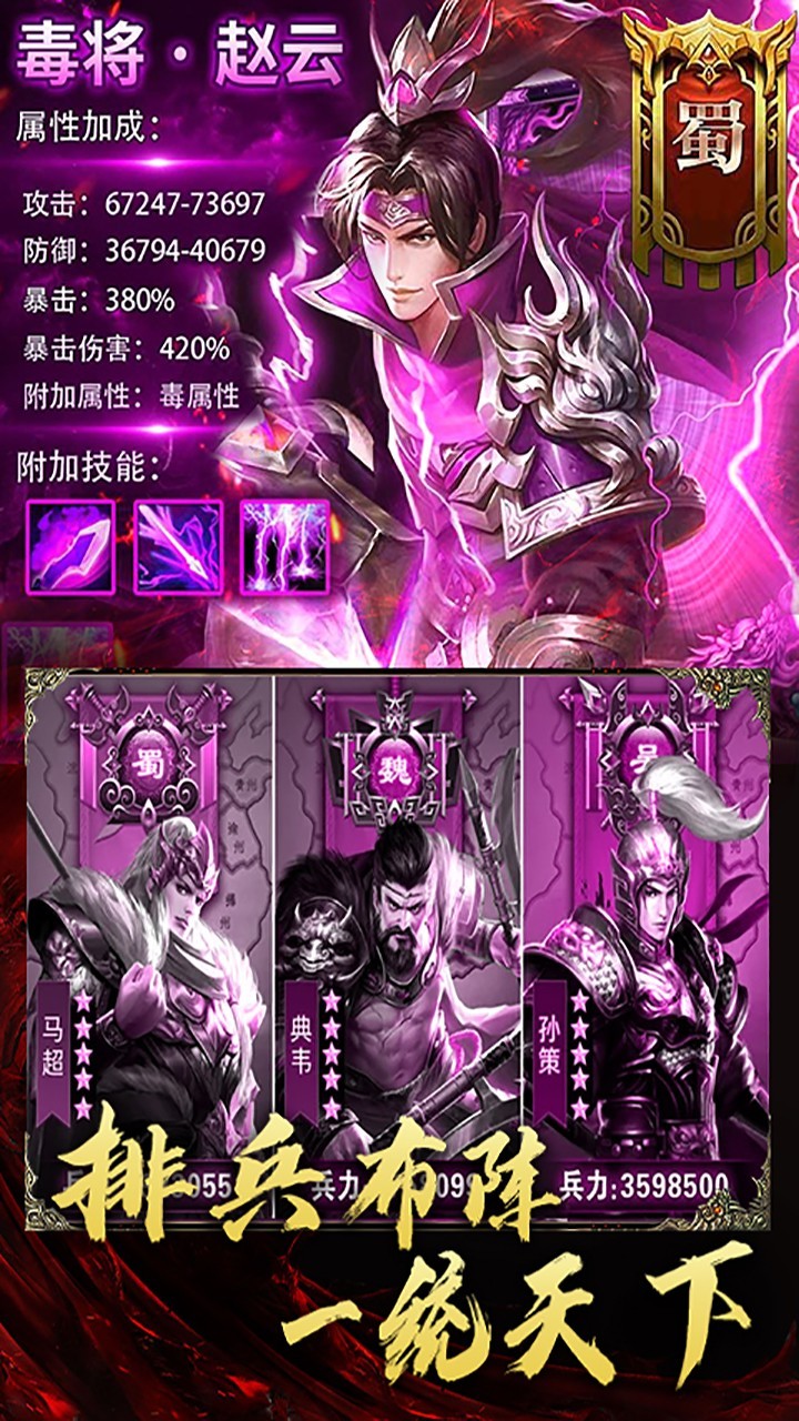 2、排兵布阵的利用武将们的各个特性帮助自己一统天下;