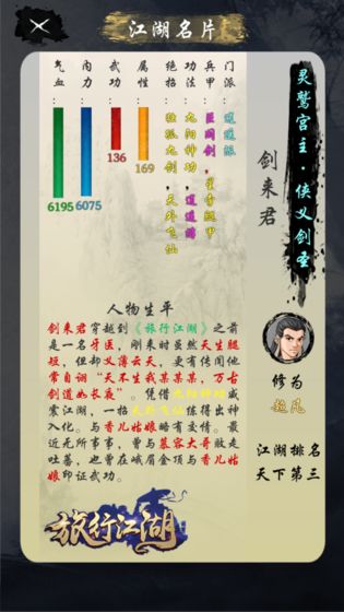 旅行江湖是一款文字项的江湖武侠角色扮演类游戏,玩家们可以尽情的在游戏中体验各种风趣的游戏玩法,感受特色的武将江湖,体验轻松却充满乐趣的武侠游戏,感受游戏的独特魅力。