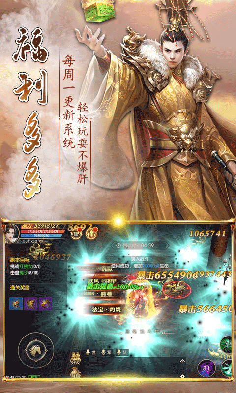 2. 上线就送满V,绑元*68888,金币*200W,更有高达30倍的投资返还和月卡返还,各种福利礼包低至1元,返利比高达270倍。