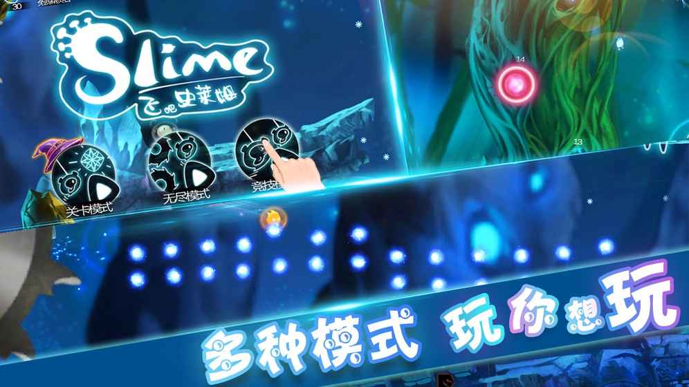 飞吧史莱姆是一款物理特效的冒险闯关游戏。小可爱史莱姆搭载透明泡泡,释放牵引绳在森林中冒险穿行,即要当心森林中的危险障碍,也要躲避后方逼近的恶魔收割机,保护史莱姆的家园。