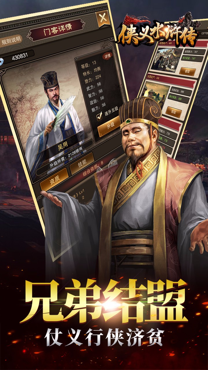 侠义水浒传是一款水浒传的宫廷角色扮演类手游,玩家们可以任意畅快的进行打造自己的城池,劫富济贫行侠仗义帮合租更多人,以自己的谋略去升官,感受极致的升官乐趣。