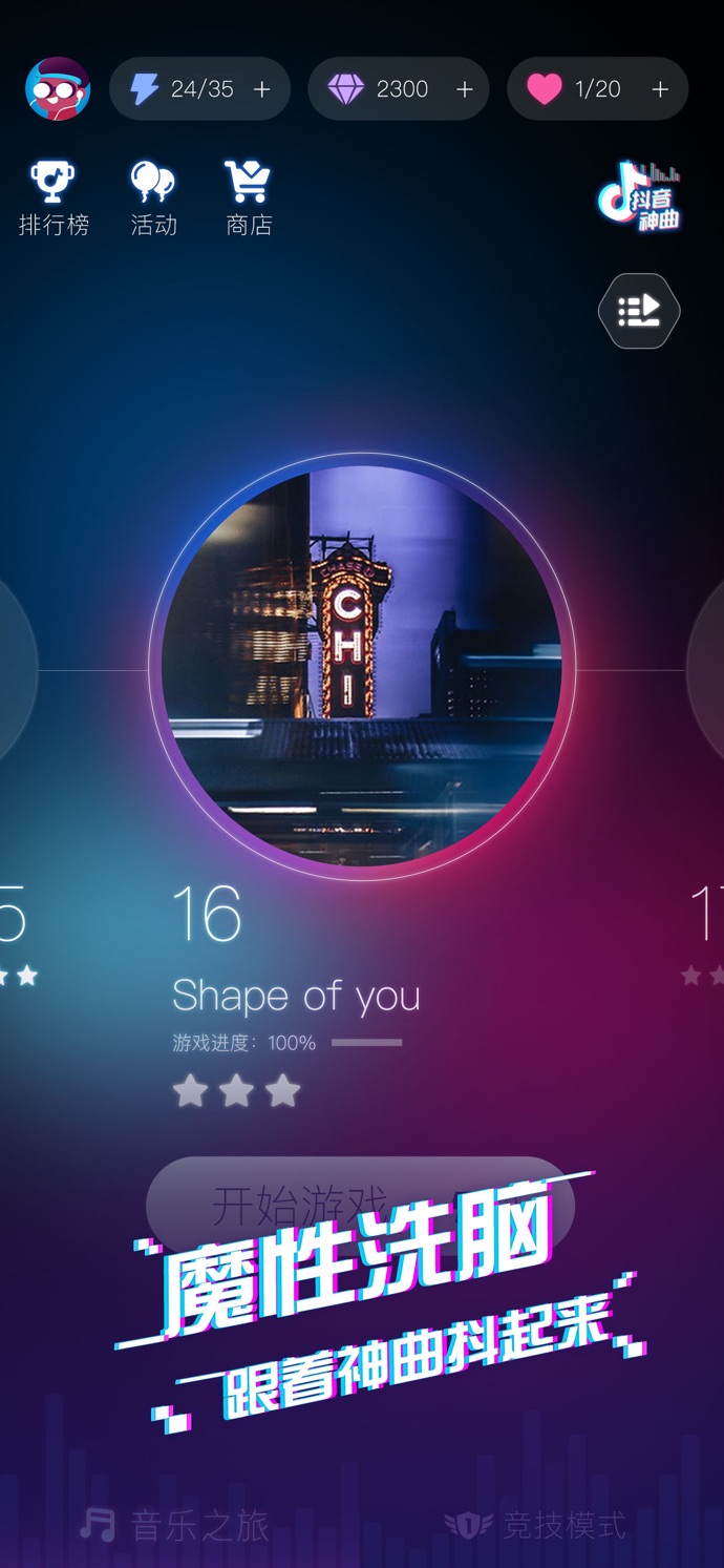 缺点也有,音乐都是抖音神曲,真的听烂了,排位来来去去都是那些(不知道是不是刚开始玩的原因,反正我一解锁了排位就一直玩,玩到没体力,歌曲容易听腻,没兴趣解锁更多。
