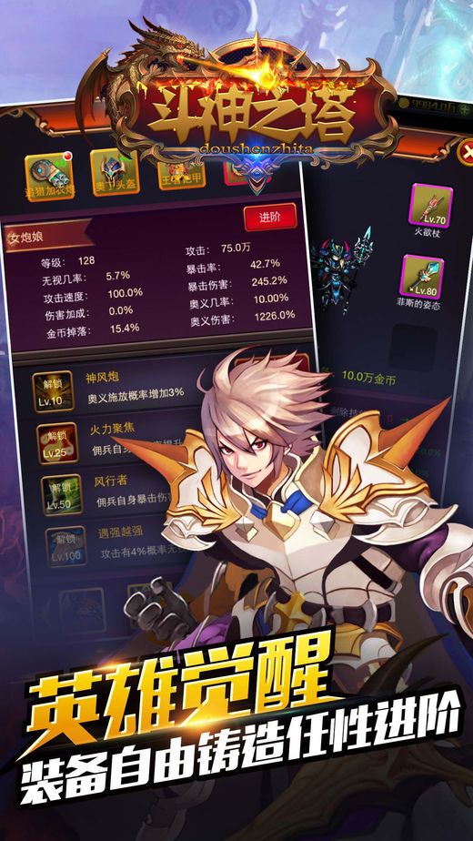 《斗神之塔》以其独创极具趣味性的点击互动玩法,再度刮起任天堂王朝的复古飓风!游戏玩法丰富易上手,离线挂机还能获得大量资源,多种副本同时进行,屠龙夺宝两不误!还可以招募各种技能酷炫的佣兵,一起组队击杀强大的BOSS。