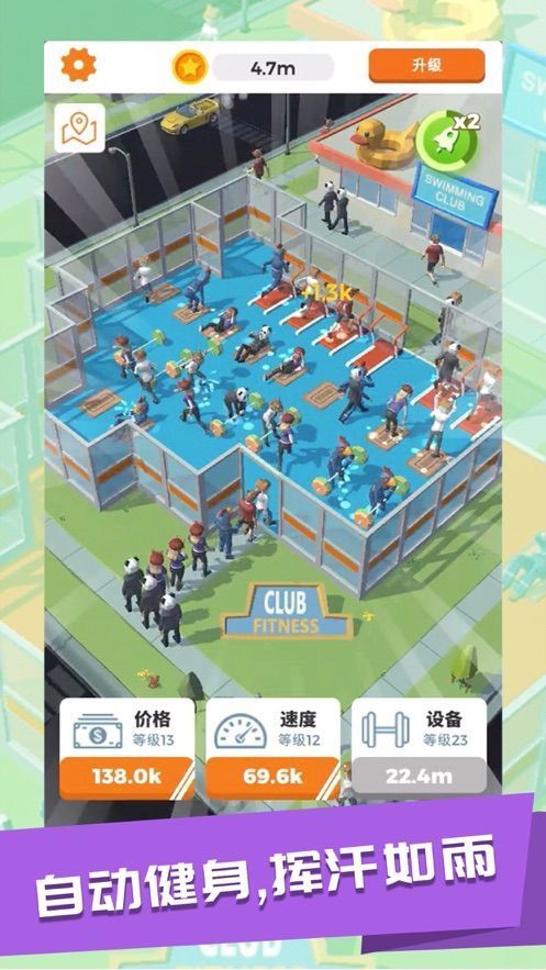 游泳健身了解一下是一款健身房模拟经营类手机游戏,游戏采用了低模卡通的画风打造,融合了放置的元素,让你轻松的运营健身房,通过增加健身设备升级服务招揽用户,成为最赚钱的健身房。