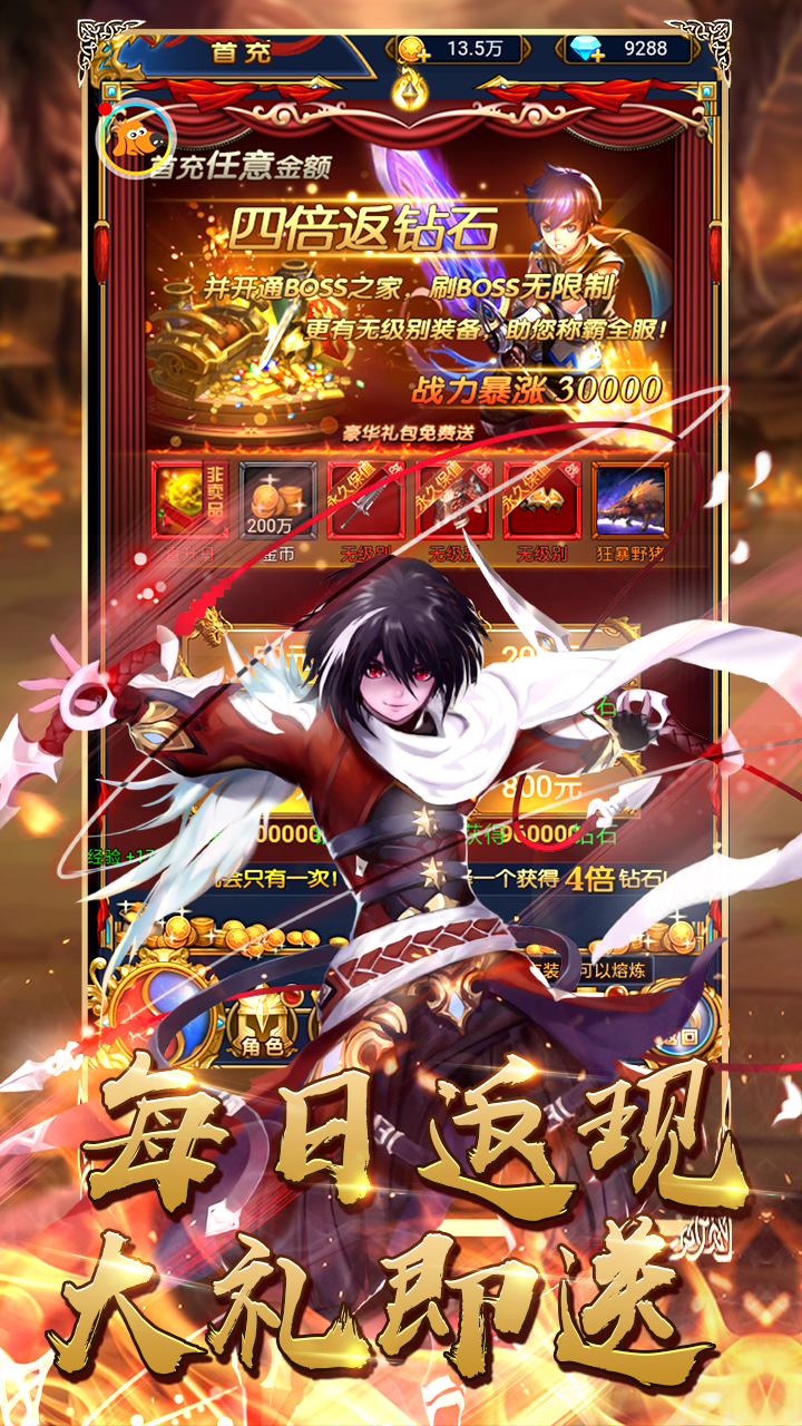 3、每日返现各种豪华大礼赠送,让你快速打造自己,迅速的融入进游戏世界;