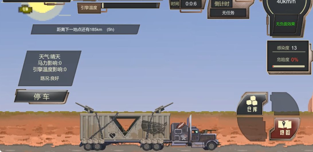 作为一位末世中的快递员,玩家需要完成各种运输任务,处理路途中的各种突发事件,经营、升级自己的车辆,招募队员扩大自己的队伍,在末世中生存下去,到达终点。是否想过,当这个世界开始破败,文明科技出现断层,你是一个普通人,眼前是苍凉的大地,却有一种奇特的自由感,你在这,活着或者死去。