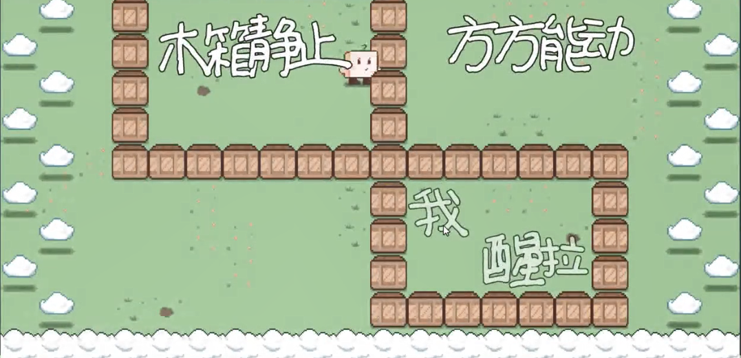 这是一款2d益智解谜向的推箱子游戏,运用中文的【主】【谓】元素构成游戏的主要谜题,游戏目的就是运用智慧突破层层险阻,拼凑文字【我醒啦】以完成通关