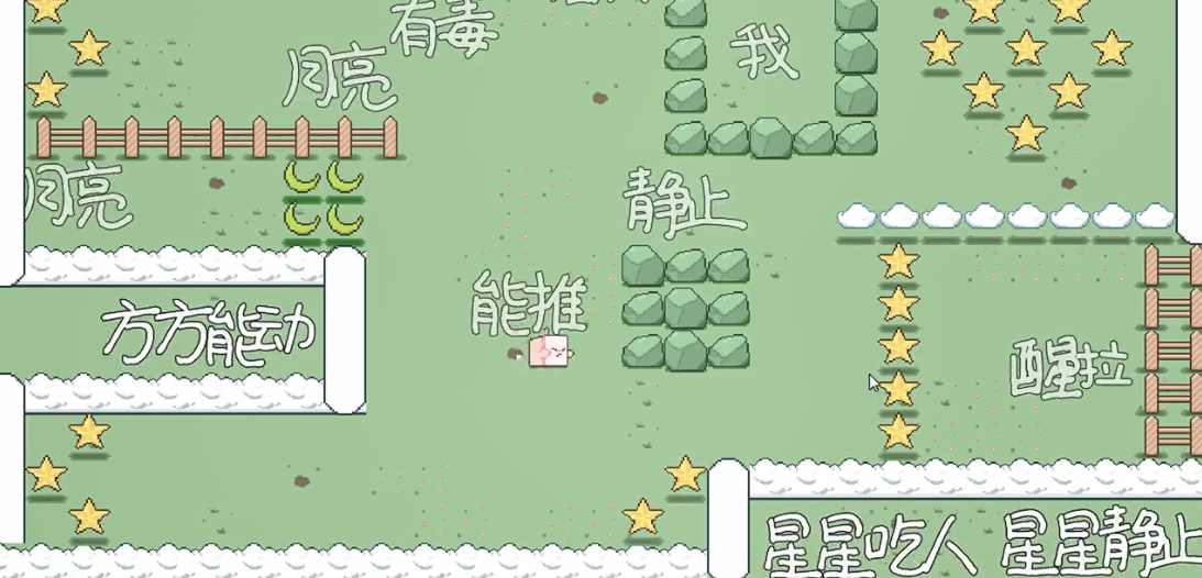 当初在steam上看到baba is you这款游戏的时候就被深深的吸引住了,一个类推箱子的游戏能做的如此精致小巧又烧脑,非常折服,因此在baba is you的基础上,我们想到了做减法,并加入我们独特的中国元素,汉字,并且尝试改变一格一格前进的推箱子形式,变成可以自由行动的操作方式来探索更多可能性,设计更加有趣的关卡与元素!