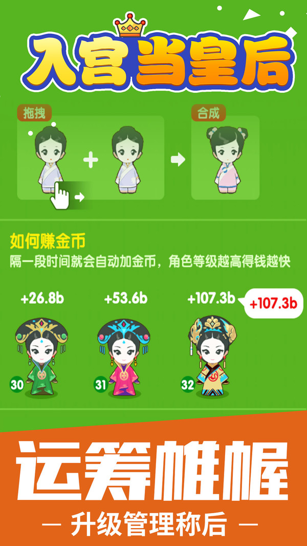 入宫当皇后是一款简单轻松的放置合成类游戏,玩法简单,通过合成更高级别的娘娘角色,体验不断上位升级的合成乐趣,让你根本停不下来。 体验上位统一天下的畅快过程。
