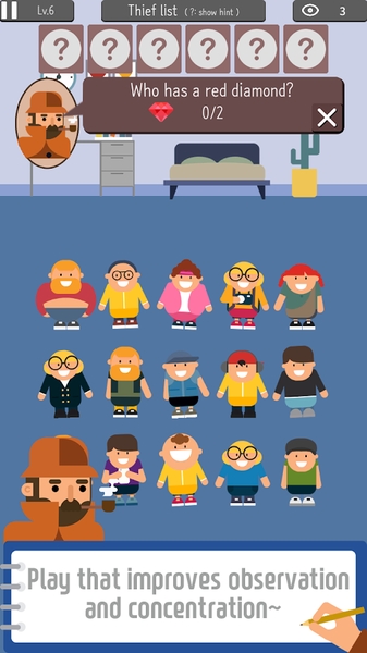 Who is the thief是一款非常烧脑的休闲解谜类游戏,玩法非常的虐心烧脑,玩家将化身为侦探,需要在限定时间内将关卡中的小偷给找出来,小偷混入了人群之中难以寻找,考验玩家的眼力和观察力,根据各种线索快速的抓住小偷,完成挑战。