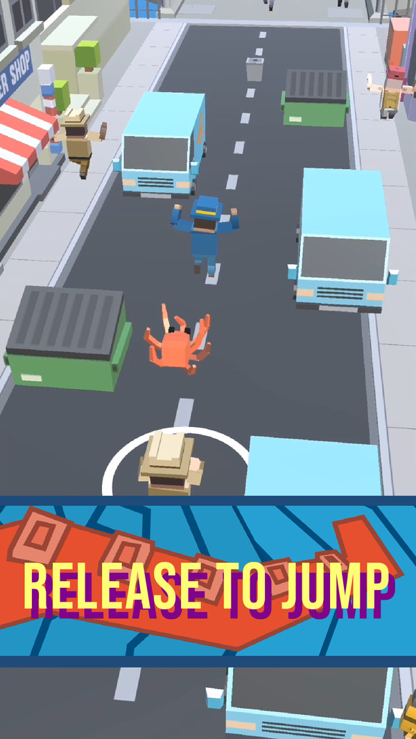 游戏的玩法十分的令人上瘾,你将需要控制着角色在路上不断的奔跑着,并通过跳跃来避开障碍物,成功的进入前方的水池中。