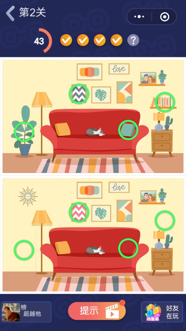 一款非常受大众欢迎的趣味找茬小游戏,简单的规则,你需要在有限的时间里找出两幅图形的五处不同即可轻松的闯关,完成度越高,还有机会赢得更多的道具帮助你进行答题,游戏玩法充满的乐趣,非常的考验你的手速和眼力,海量的关卡随时都能进行挑战。