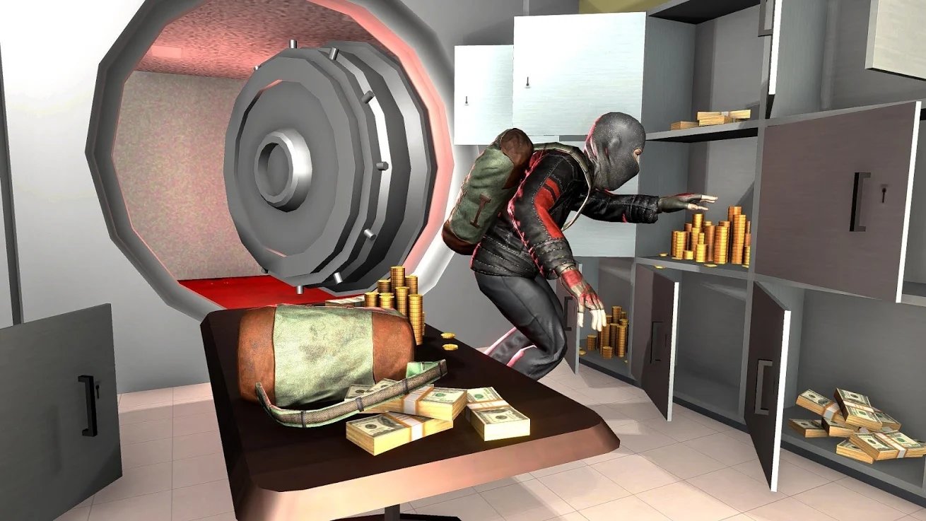 一款模拟冒险即时的射击游戏。在这个游戏中你将扮演一位小偷,你最近在谋划一个抢劫银行的大案,不过你先需要找一些武器装备,在叫上你的同伙,一起去抢劫银行,同时也要与警察周旋,成功的抢劫走银行的现金,安全的逃离警察的追捕,那么你就可以成功的完成任务了。