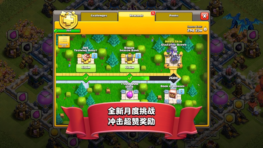 3.参与部落之间的挑战和竞技,和其他成员一起战斗,齐心协力在斗争中将魔法物品赢取到位。