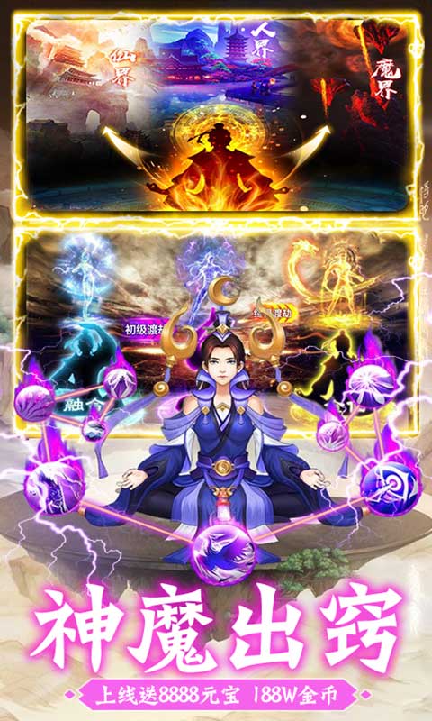 2. 上线送8888元宝,188W金币,VIP5,不搞那些假福利,直接就送充值的元宝!!坚持登录还能免费升VIP,简直就是福利手游!