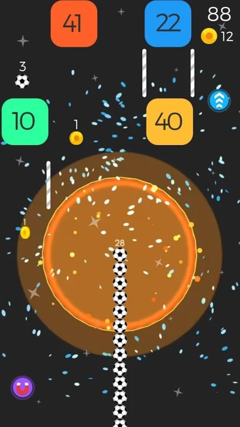 打击撞块的贪吃蛇真的是很难受,在游戏中有着各种各样的砖块等你去撞碎,玩家操作自己的小蛇快速的行走,躲避障碍,在实在没有路的时候选择一个数字最小的砖块装上去,头破血流也要将砖块撞碎,记得收集游戏中的相爱小点点来增加自己身躯的长度!