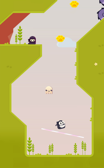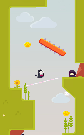 在这个游戏里面玩家人物是一直可爱的猫咪形态。玩家需要在猫咪掉落的时候滑动屏幕出现一条绳索,猫咪踩在绳子上面就可以跳跃,躲避危险到达终点。