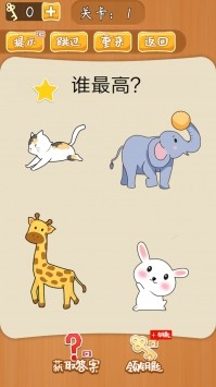 很简单的一款休闲益智手游,这款手游适合年龄小的小朋友来玩,这款手游中的关卡答案特别的简单,虽然每一个问题都是不一样的,答案也是需要一定的思考的,对于小朋友来说难度适当吧,舒适的背景音乐,可爱的动物形象,也是很适合小朋友来玩的。