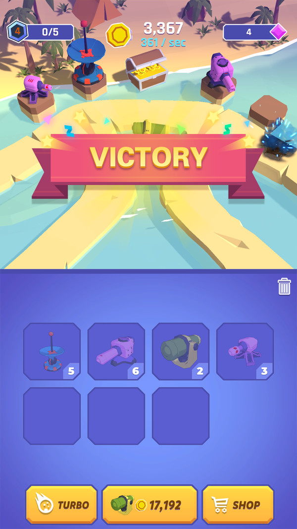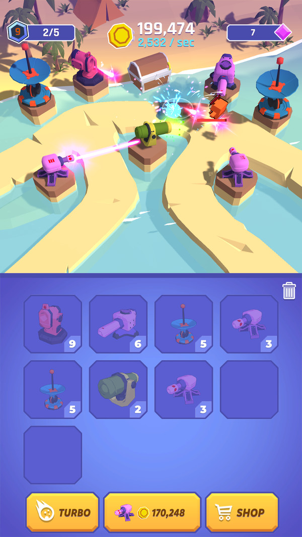 合并炮台是一款卡通风格的合并塔防游戏。在固定的关卡环境中你要收集各种大炮将它们放到不同的炮台上,根据你敌人进攻的情况来及时的补充大炮。喜欢的小伙伴们快点来点击下载吧。
