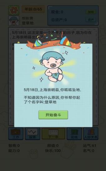 一款彩绘风的模拟经营手游。在这里你将体验一次新生,从出生开始,你正式开始一段全新的人生冒险,这一次,所有的一切都由你主宰,是做一个平凡的普通人,还是声名显赫的国际巨星,或是叱咤风云的商界大亨,来经营自己的全新人生吧!