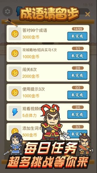 成语请留步红包版是一款益智休闲成语游戏,游戏具有精美的画面风格,众多三国人物重现和你一起猜成语,顺利通关后还可以获得成语的解析,帮助你边玩边学寓教于乐,丰富自己的成语知识积累。