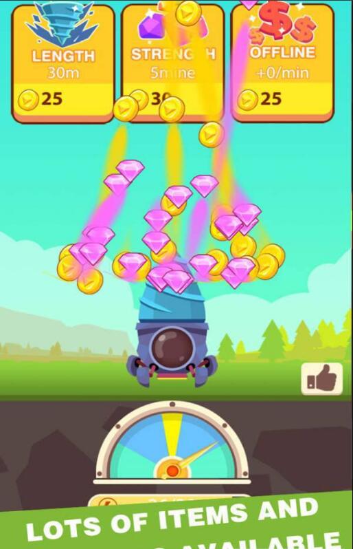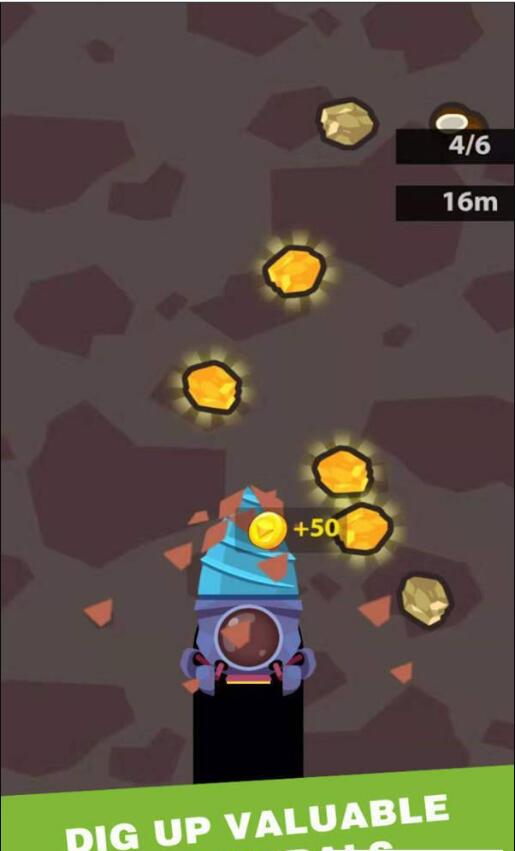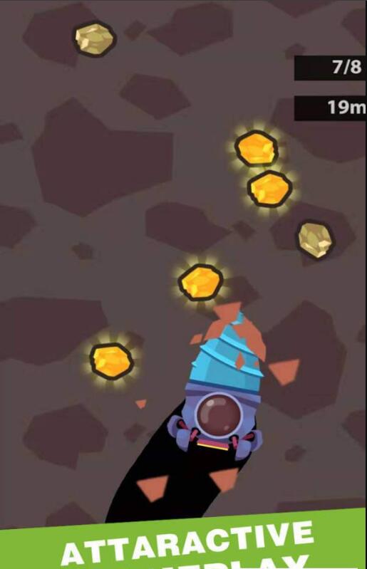 玩家将在游戏中操控一个巨大的挖矿机进行闯关,游戏内有着大量宝石等待着玩家前来挖掘收集,玩家还可以将这些宝石换取金币来升级自己的挖矿机机哦。