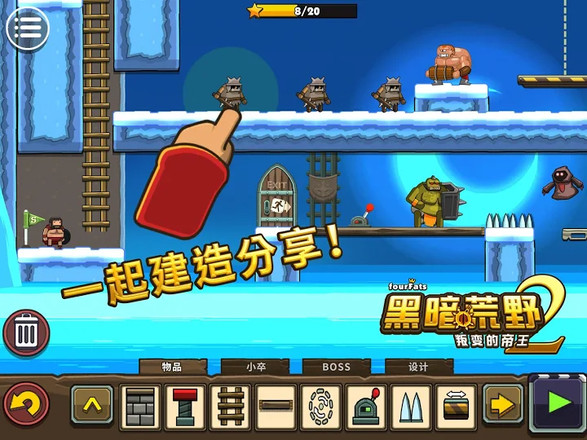 2.将自己创造的关卡分享给朋友们,在线和朋友联机冒险,一同去挑战这有趣的关卡,收集武器和装备强大自己的实力。